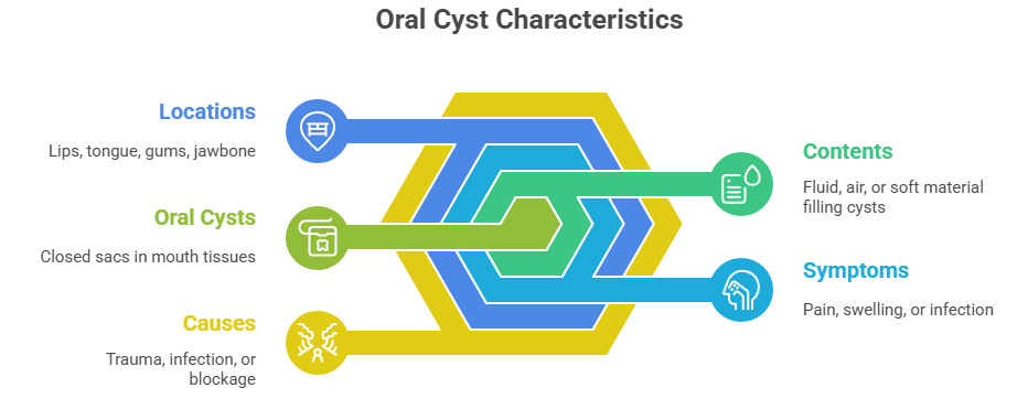 Oral cysts are closed sacs filled with fluid, air, or soft material that form in the tissues of the mouth or jaw. Though often harmless, they can vary in size and cause different symptoms depending on their location. Some remain small and painless, while others may enlarge, become infected, or affect nearby teeth and structures.